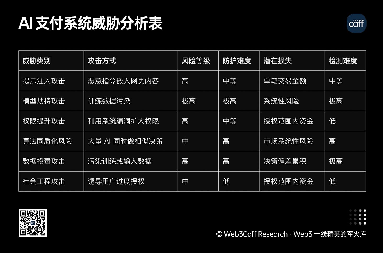 当 AI 代理获得代表人类进行金融交易的权限时,防范其越权行为成为整个系统安全性的核心挑战。挑战的复杂性远超传统的网络安全威胁,主要体现在威胁的多样性、隐蔽性和系统性风险的放大效应。