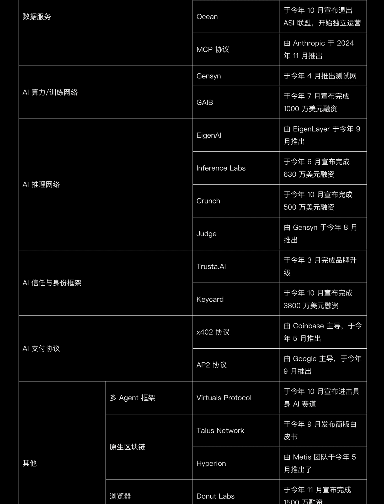 🔹 特色赛道布局:AI 信任与身份框架(Trusta.AI、Keycard)如何构建 Web3+AI 的安全底座?x402 协议、AP2 协议等 AI 支付协议的核心设计逻辑是什么?多 Agent 架构(Virtuals Protocol)、AI 原生区块链(Talus Network 等)、Web3+AI 浏览器(Donut Labs)分别开辟了哪些新场景?