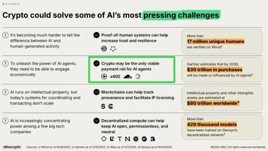 《加密技术解决 AI 核心挑战》示意图,图源:Andreessen Horowitz